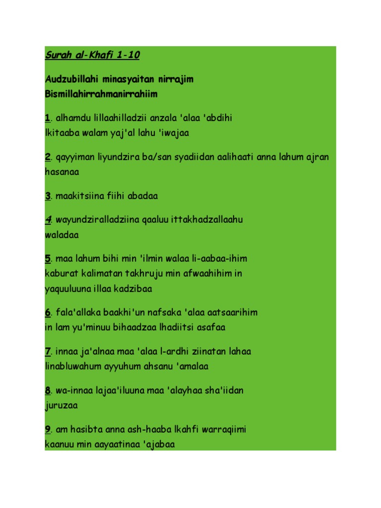 Bacaan surah al kahfi rumi (transliterasi) dimulakan bacaan surah al kahfi dengan bismillah 1. Rasulullah saw menyatakan bahwa tekad jadi penentu. Webوَلَمۡ يَجۡعَل لَّهُۥ عِوَجَاۜ ١ all praise is for allah who has revealed the book to his servant, 1 allowing no crookedness in it, 18:2 قَيِّمٗا لِّيُنذِرَ بَأۡسٗا شَدِيدٗا مِّن لَّدُنۡهُ وَيُبَشِّرَ ٱلۡمُؤۡمِنِينَ ٱلَّذِينَ يَعۡمَلُونَ ٱلصَّٰلِحَٰتِ أَنَّ لَهُمۡ أَجۡرًا. Webbacaan surah al kahfi rumi (transliterasi) dimulakan bacaan surah al kahfi dengan bismillah 1. Websurah al kahfi 1 10 rumi : Suarah al kahfi pdf. Tajwid surat al kahfi ayat 1 5 masrozak dot com. Alhamdu lillaahil lazeee anzala 'alaa 'abdihil kitaaba wa lam yaj'al. Terjemahan dan rumi disertakan. follow kami di :subscribe :