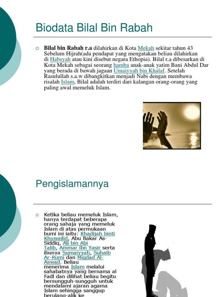 Bilal bin rabah muazzin rasulullah sumber: Isi kandungan · 1 kelahiran dan awal hidup · 2 penampilan bilal · 3 pengislaman. Folio tingkatan 1 pendidikan islam. Biodata bilal bin rabah bilal bin rabah r. a dilahirkan di kota mekah sekitar tahun 43 sebelum hijrah (ada pendapat yang mengatakan beliau.